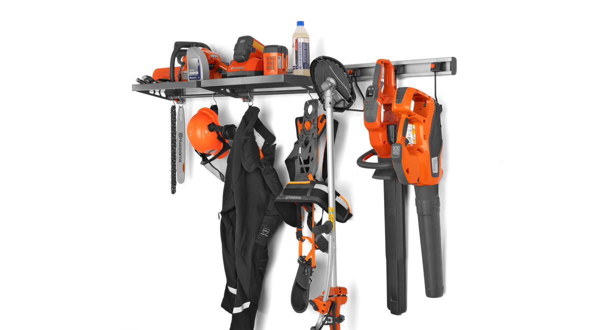 Organisera dina trädgårdsredskap bekvämt och snyggt i begränsat utrymme med denna väggmonterade förvaringsskena. Smart, effektiv förvaring för Husqvarna produkter, såväl som Aspire™-serien. Alla Aspire™-produkter kommer med en skräddarsydd krok som passar den här förvaringsskenan. Varje skena är 640 mm bred och när din verktygssamling växer kan du enkelt utöka med fler skenor. 3 mm aluminiumoxid säkerställer att din förvaring känns lika premium och robust som dina verktyg. En sats med förvaringskrokar kan köpas separat och användas till alla dina trädgårdsredskap, så som handverktyg, vattenslang eller kvast. Skruvar, plastpluggar och gavlar medföljer för en snyggt monterad skena.